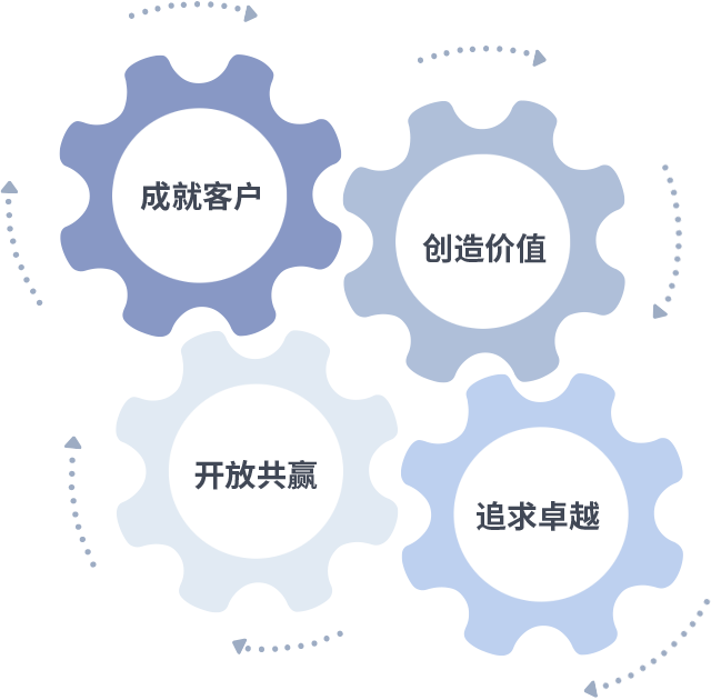 成就客户是一切决策的出发点,,创造价值是衡量所有工作的标准,,,追求卓越是我们做事做人的态度,,,开放共赢是我们的格局也是最终的结果。。。。价值观的齿轮环环相扣,,,,推动着组织里的每个人不断向前。。。